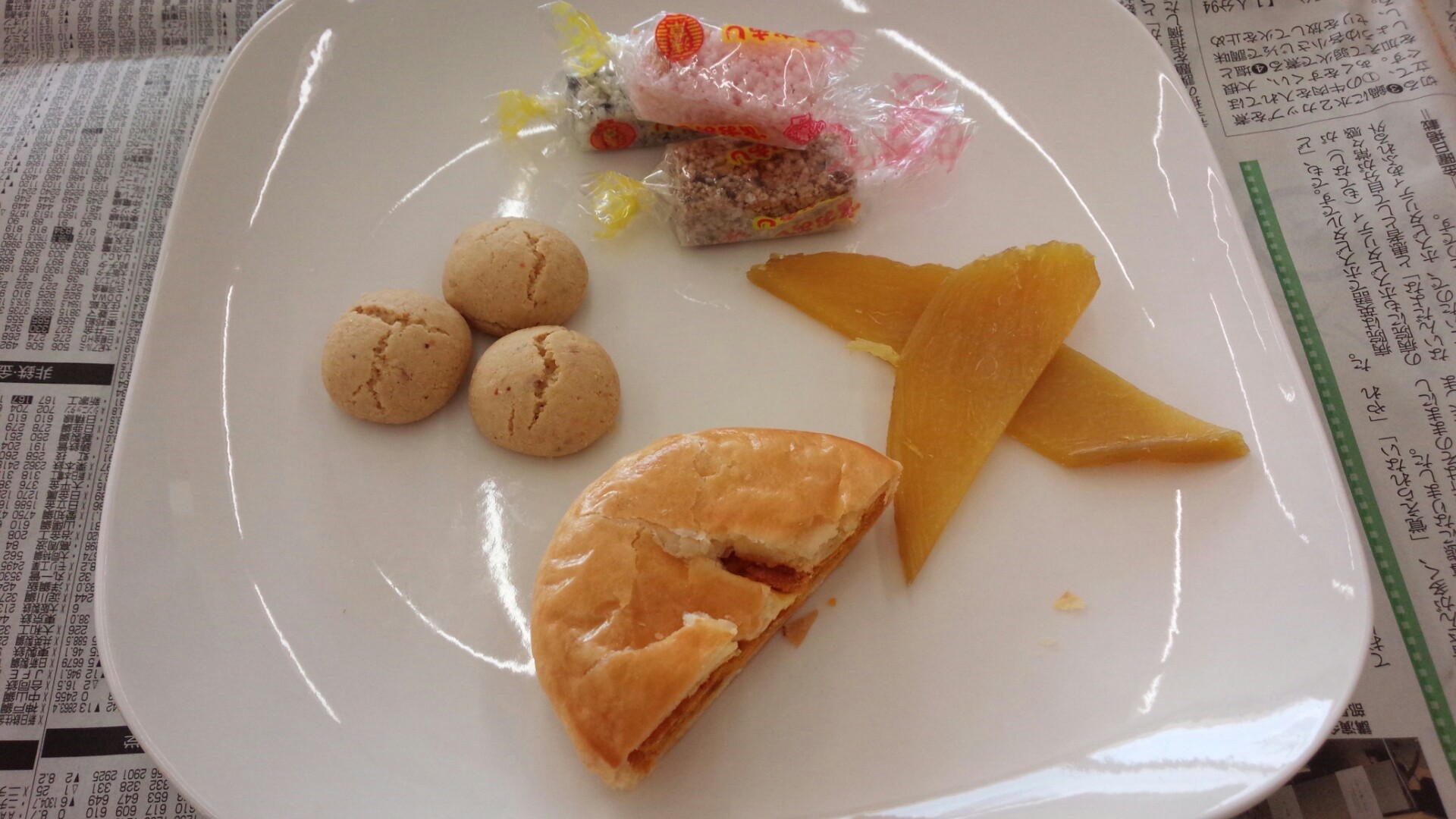 奥から時計回りに雷おこし(東京)、干し芋(茨城)、パンプキンパイ(秋田)、まころん(仙台)