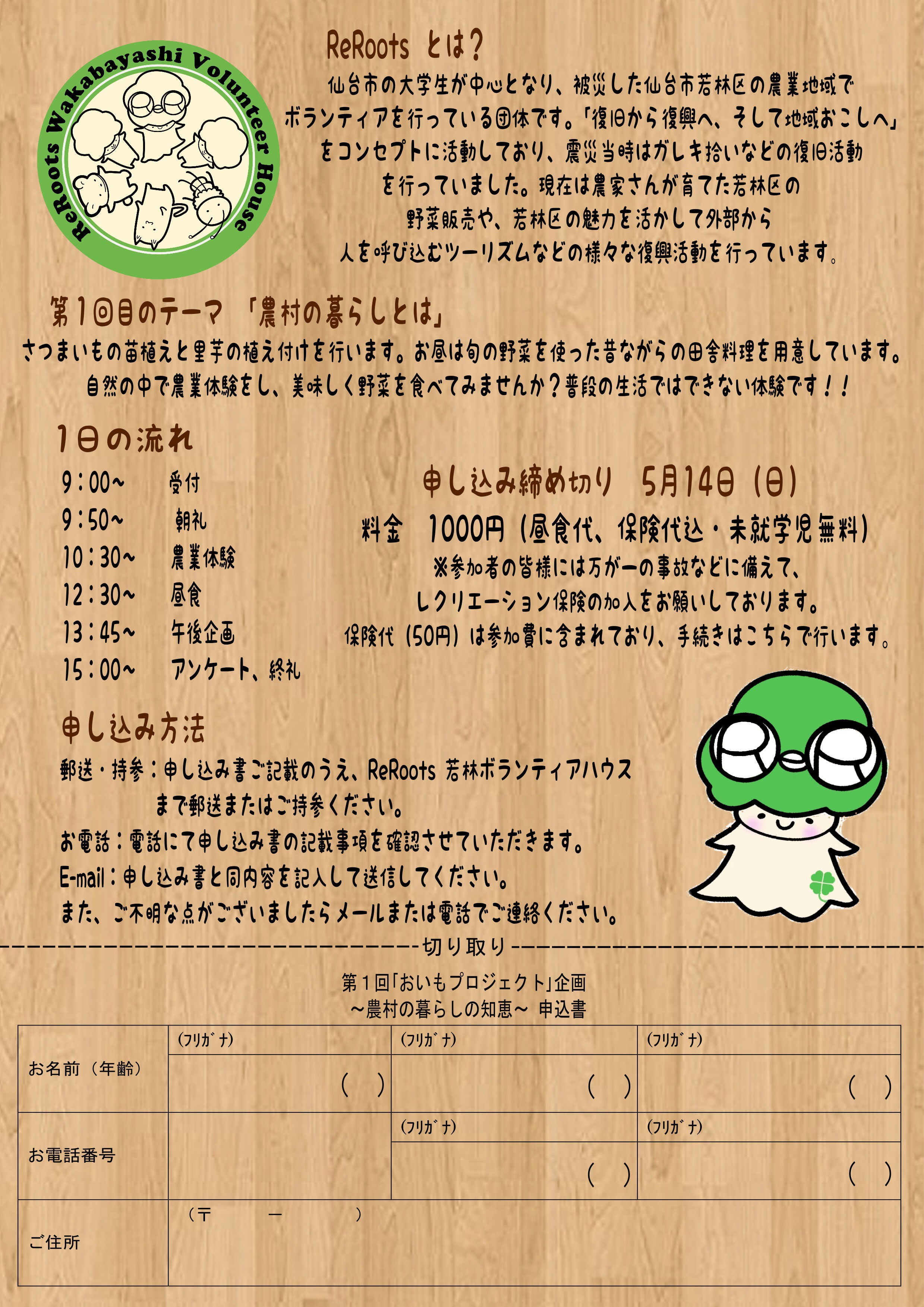 ReRootsは、東日本大震災による津波被災地の復旧から復興、更には地域おこしにむけて、仙台市若林区のボランティアハウスを拠点に活動する団体です。 ボランティアをしたいけど、何をしたらいいか分からないという方も歓迎です。お気軽にお問い合わせ・ご来場ください!