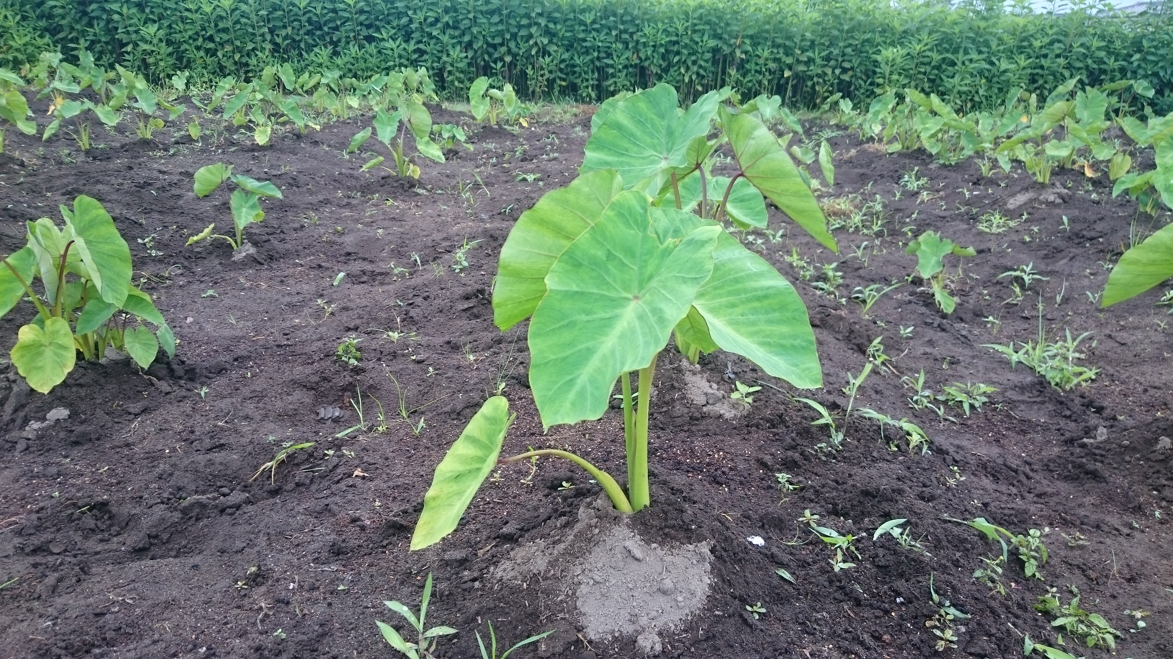 写真は第一回で植えたおいもの今の様子です。上の画像がさといも、下の画像がさつまいもです。さといもは地面から30センチくらいの高さまで生長し、さつまいもは前よりも葉の数が増え、下が見えないほどになっています。