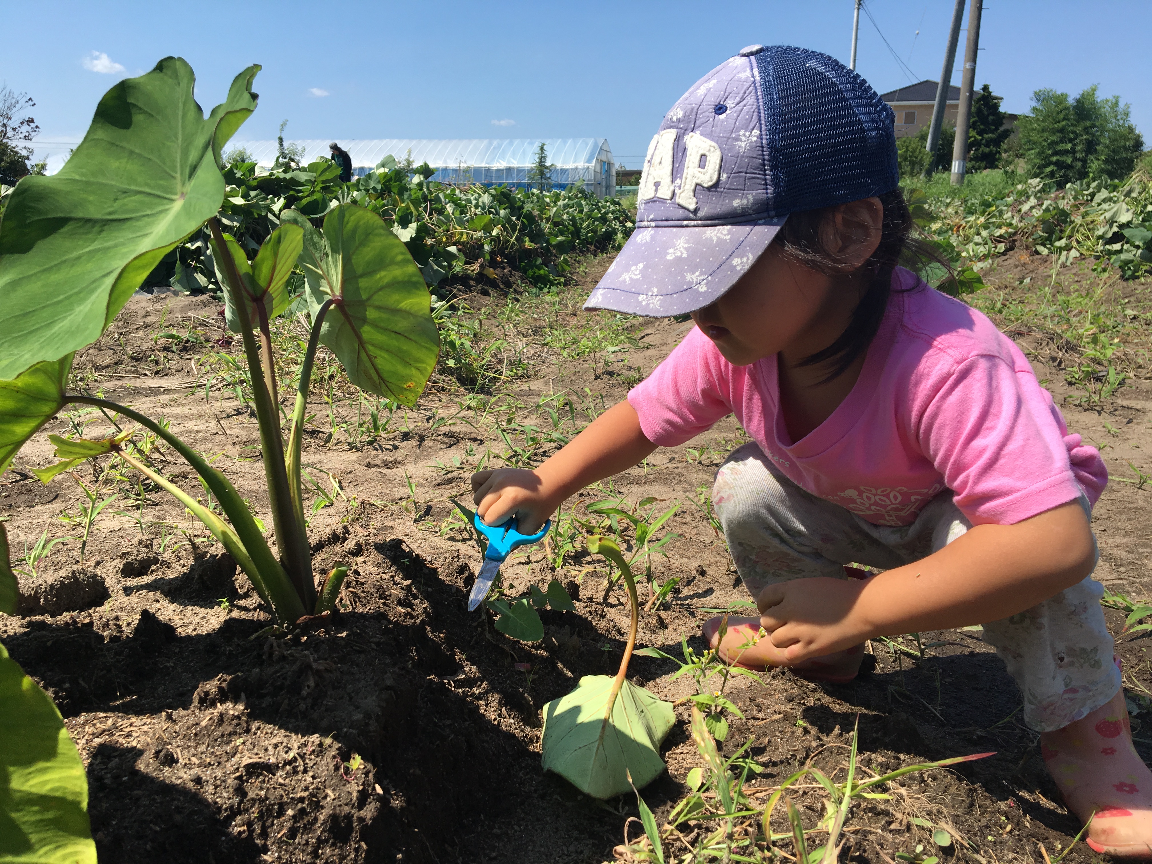 里芋は、畑をお借りしている農家さんの育てている里芋と比べたりして、小さい葉や、枯れた葉の間引きをしました。