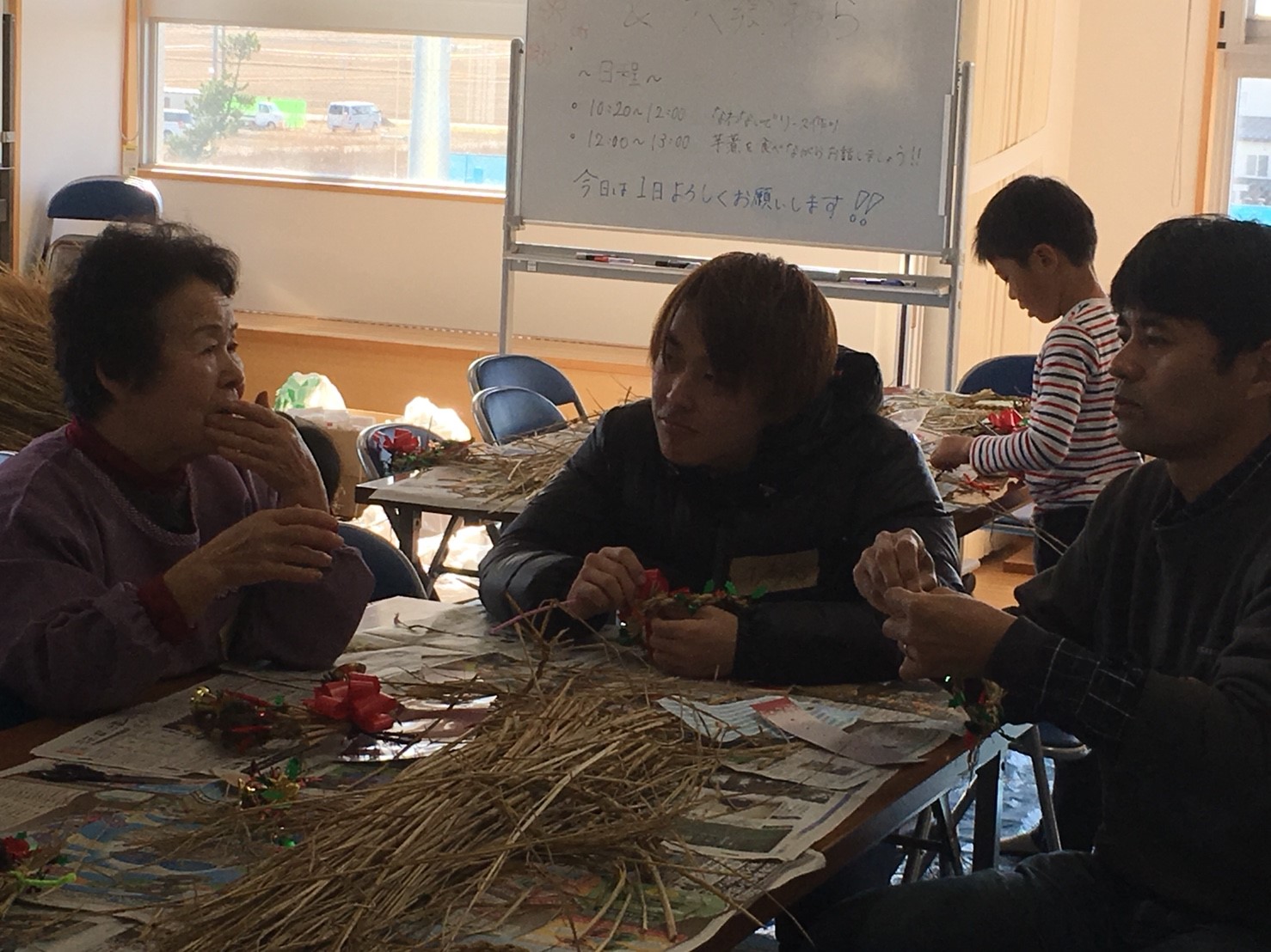 午前中はわらでできたリースに飾り付けをして、クリスマス飾りを作りました。飾り付けの仕方は各々で違い、自分オリジナルの飾りを作ることが出来て満足した様子がうかがえました。三本塚市民農園の利用者さんから縄ないを教わりたいという要望から、地域の方々による縄ない教室も始まりました。会話を楽しみながら、地域の伝統である縄ないを学ぶことが出来るよい機会となりました。