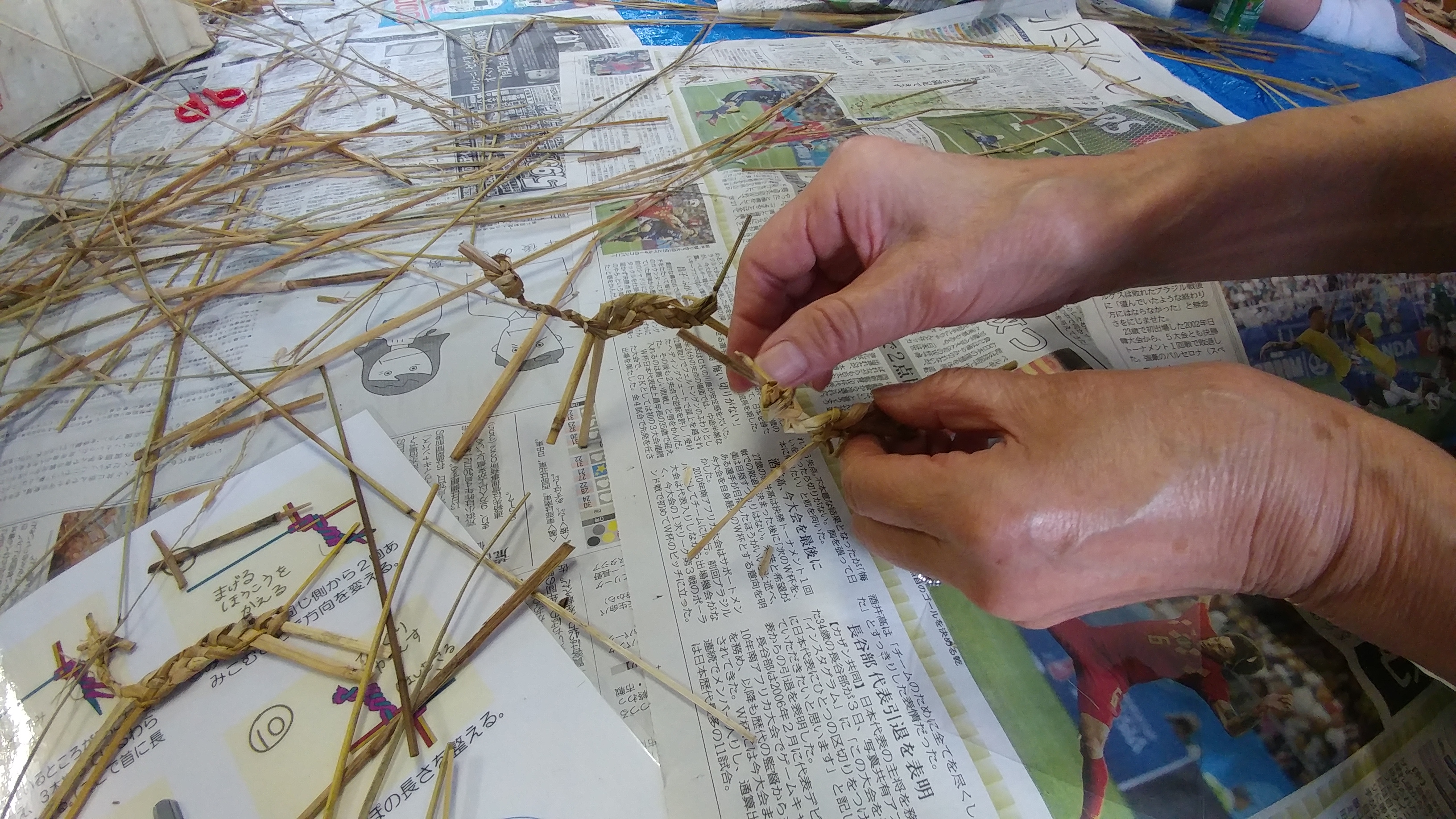 柴田町町内会の方々にもご協力頂き、初めての仙台市都心部での出張型ワークショップとなりました。笹屋敷地区から2人の住民さんを講師としてお招きし、わらない、わら細工作り体験をしました。