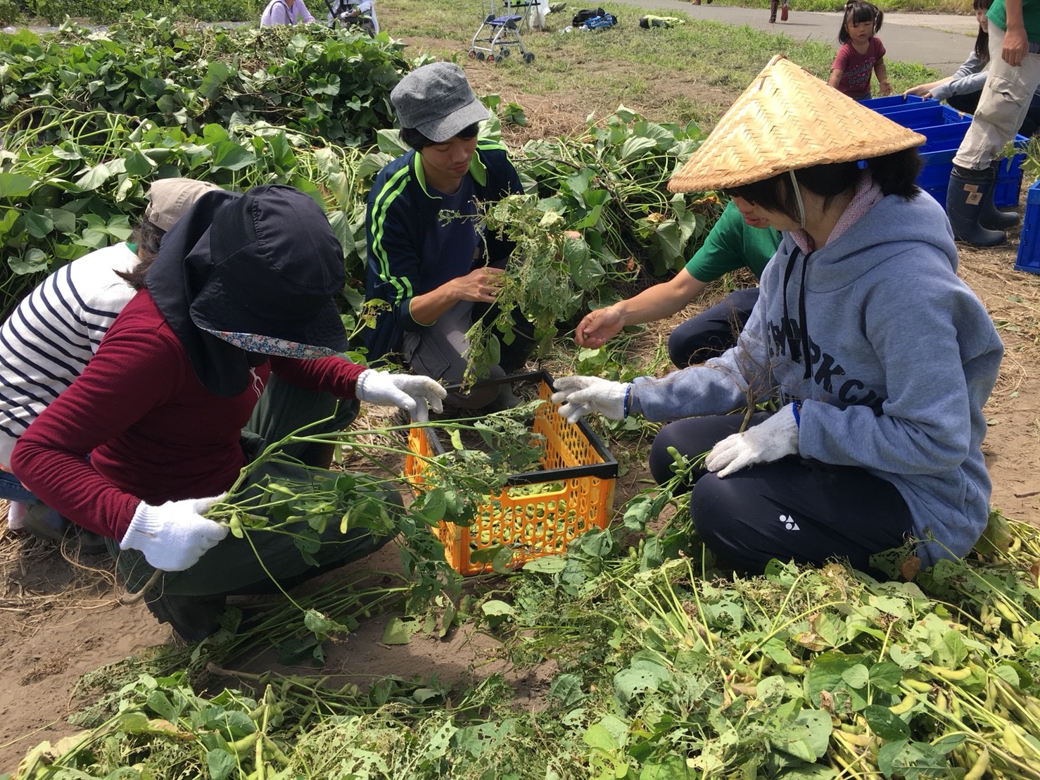 たくさんのサツマイモ、ではなく一つひとつがしっかりとした美味しいサツマイモを目指す工程、それが蔓返しなのです。 畑では蔓返しだけでなく、枝豆の収穫・もぐ体験も行いました。枝豆は根が強くはっていて、参加者さんたちも抜くのに一苦労の様子でした。参加していた子どもたちも一人では抜くことが難しく、親御さんやメンバーと一緒に収穫していました。かくいう私たちもその重さに驚かされ、一人で枝豆を抜くのは大変でした。またこのほかにも私たちの畑は農薬を使わないようにしていていたのですが、それゆえムシがついてしまって葉っぱが食べられてしまったこともありました。
