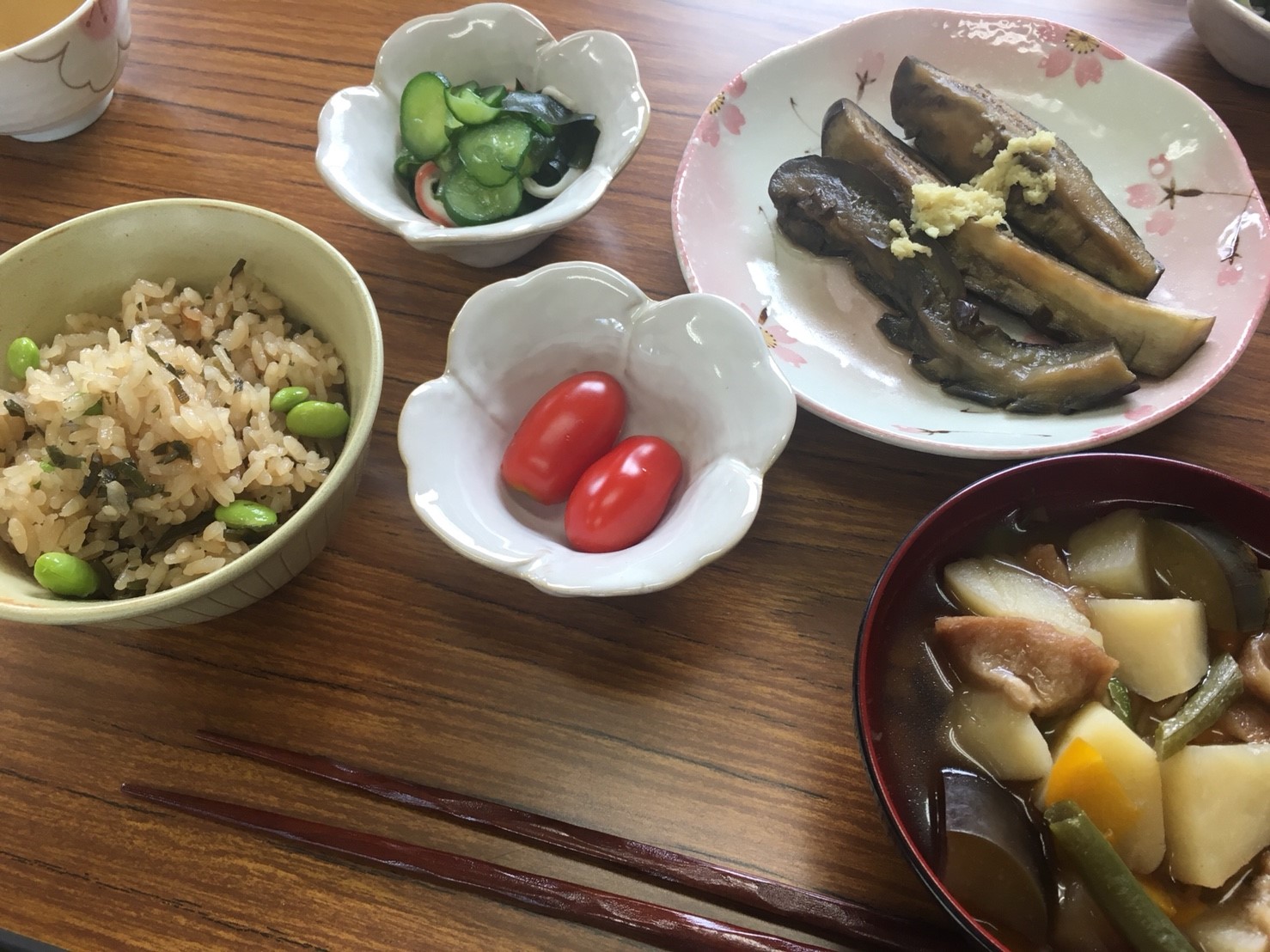メニューは枝豆と塩昆布の炊き込みご飯、きゅうりの酢の物、、地元の方にもらったトマト、なすの煮浸し、おくずかけでした。 おくずかけは地域の郷土料理で食べながら地域の文化に触れることができました。参加者さんにも地域の文化を感じてもらうことができたと思います。美味しい料理を食べながら参加者さんとも楽しくお話しできました。出された料理に対して講評をいただいたり、午前中に行った畑での作業について話したりといい時間を過ごすことができました。ごはんは美味しいものを食べることもいいですが、みんなで楽しく、が一番ですね。