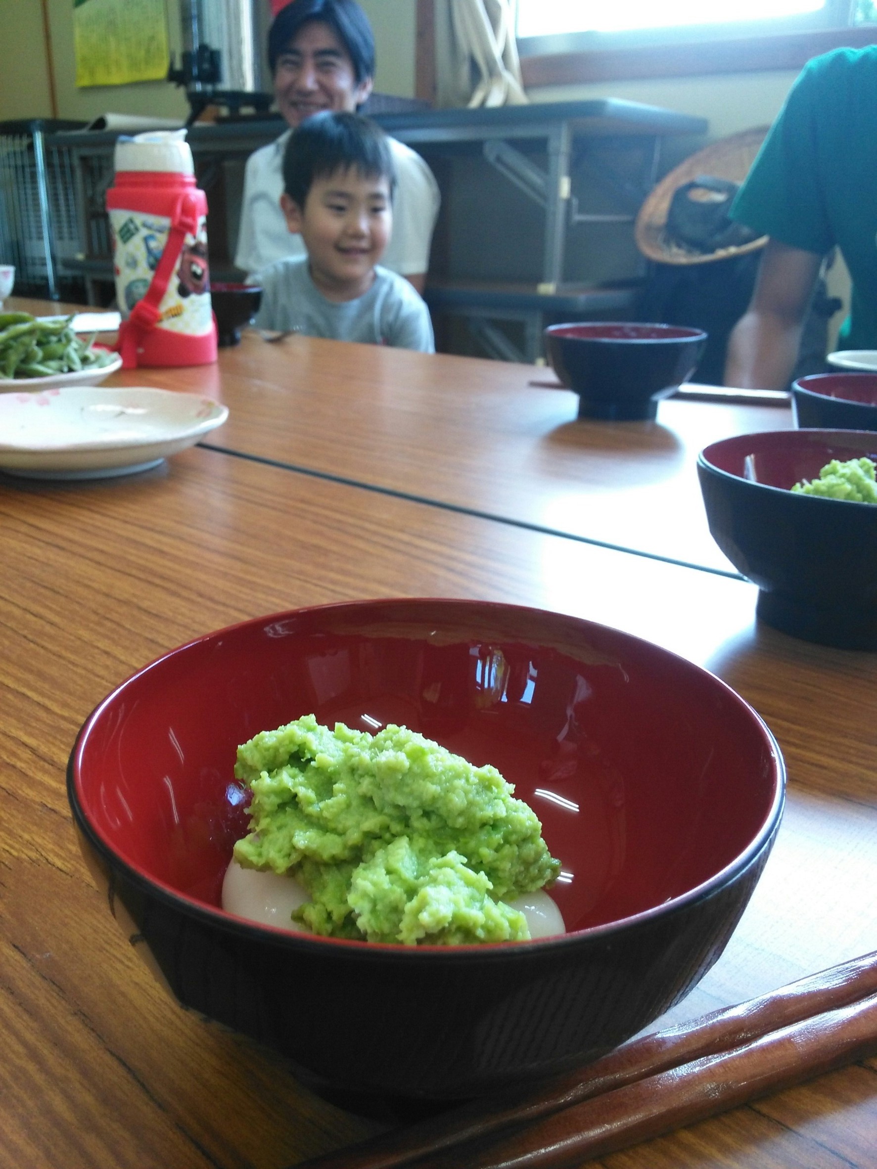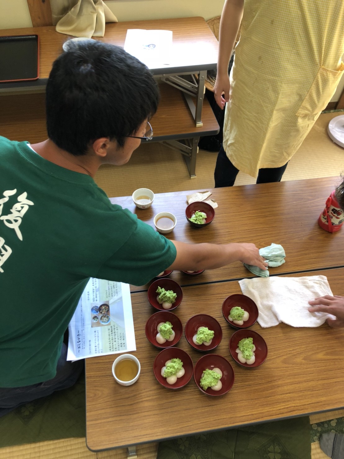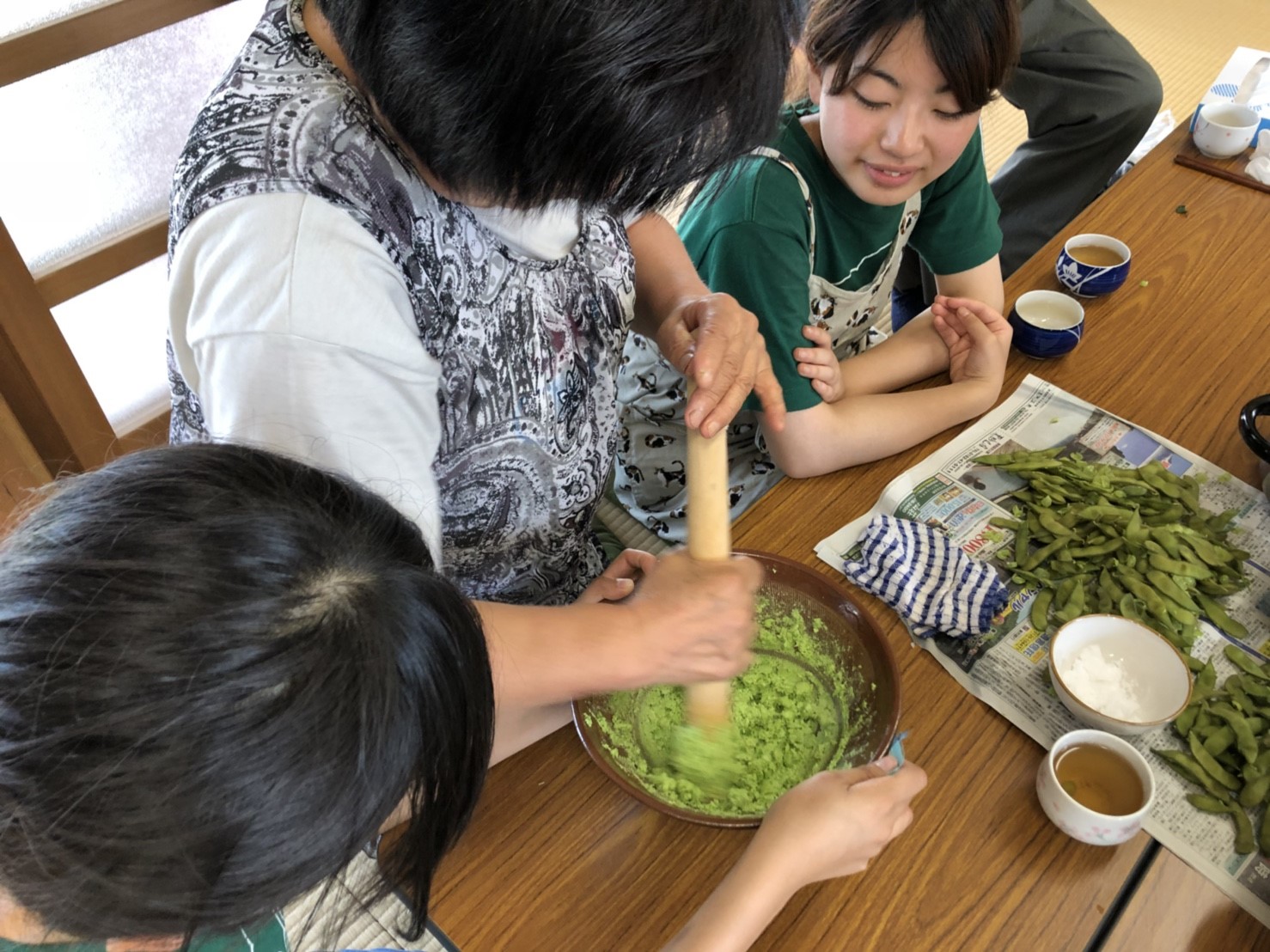 ずんだ作りは、枝豆をひたすら取り出して、すり鉢でつぶすという意外と単純な作業で進んでいきました。しかし単純ながら力のいる作業は地味に大変で、腕が疲れちゃいました。そんな苦労ゆえにできたときの喜びはひとしおでした。できたずんだは白玉にかけていただきました。