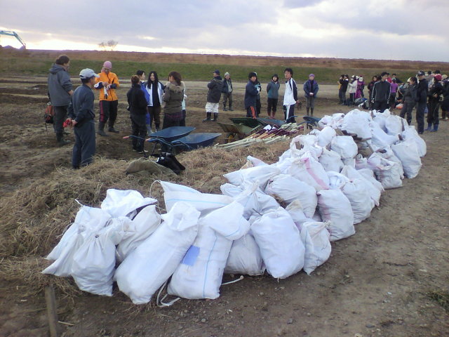 写真の土のう袋は今まで出てきたがれきです。