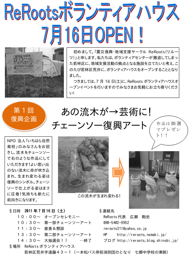 ReRootsは、東日本大震災による津波被災地の復旧から復興、更には地域おこしにむけて、仙台市若林区のボランティアハウスを拠点に活動する団体です。