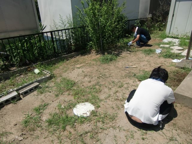 ボランティアハウスの敷地で草取りをした後に、若林区内で暮らす高齢者の方のお手伝いとして、4人で1時間半ほどかけて、草取りを行いました。