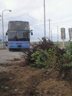 バスと切り株にワイヤーをひっかけ、そのままバスの力で引っ張るというものでした。