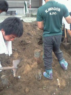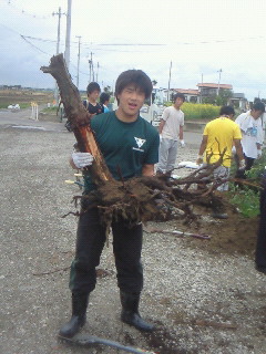 こちらは抜けた根っこを持ち上げるラグビー部員。
