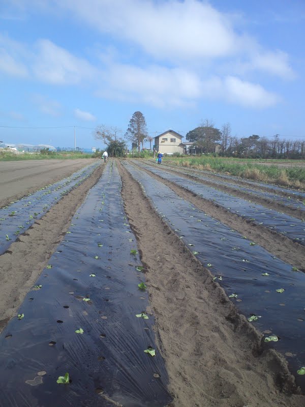 今日の活動は三本塚という地域での、古いマルチという畑にかぶせられた黒ビニルをとる作業と、冬野菜の白菜の苗植えです。