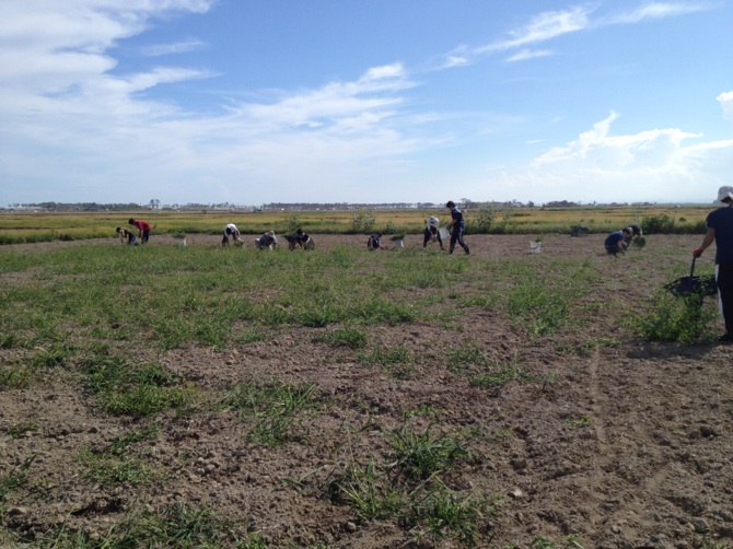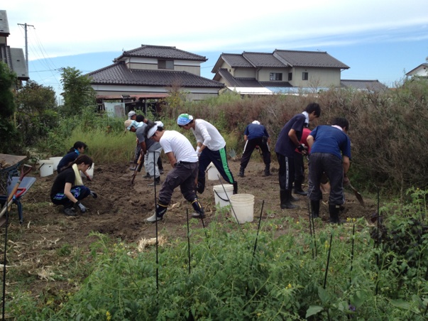 午前は畑の土おこしでした。ここの畑では震災後、津波で運ばれてきたヘドロと一緒に、塩の影響の大きい表土も取ってもらったそうです。そのため今は、その下の固い層が上の方に出てきてしまっている状況です。